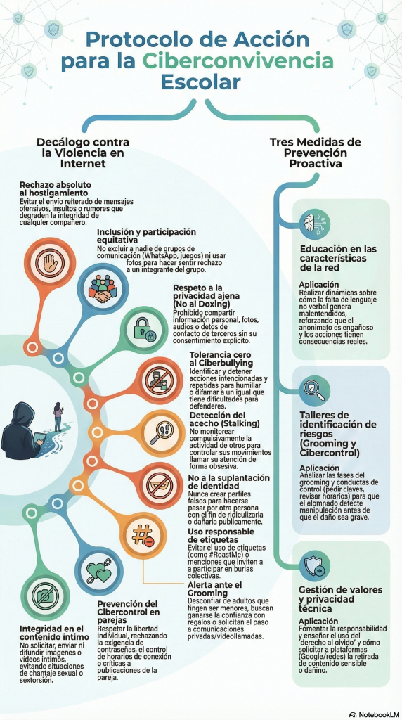 Con el objetivo de reflexionar y actuar ante estas problemáticas, presentamos este mapa mental en formato decálogo/protocolo de acción contra la violencia en Internet hacia el alumnado. En él se recogen medidas concretas de prevención, actuación y acompañamiento que pueden aplicarse en el centro educativo para fomentar una convivencia digital sana y segura.