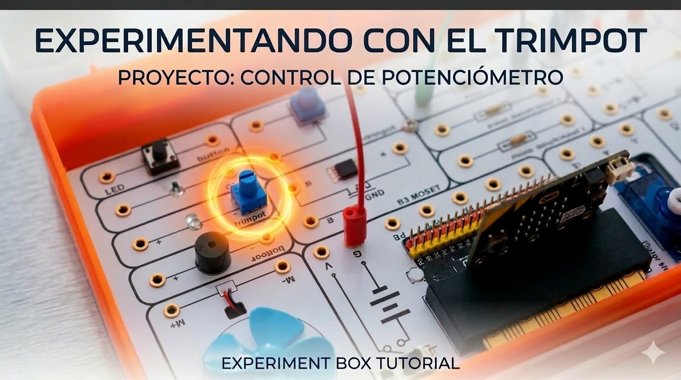 1. Introducción En este proyecto utilizaremos un Trimpot (potenciómetro de ajuste). Es una resistencia variable que nos permite enviar valores entre 0 y 1023 a la Micro:bit dependiendo de cuánto giremos la perilla. 2. Material necesario 3. Explicación de lo …