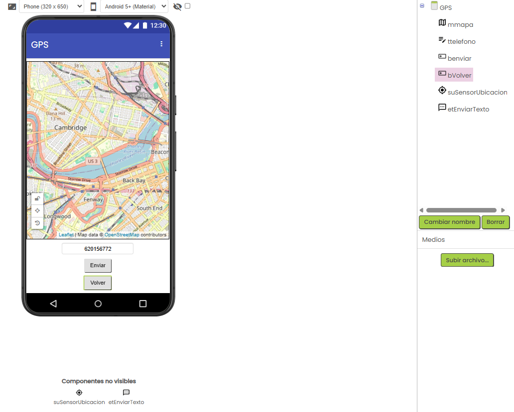 1. Crear un botón para acceder a la pantalla GPS en la pantalla principal. 2. Añadir una pantalla nueva con el nombre GPS. 3. Programar el botón GPS de la pantalla principal para que vaya a la pantalla GPS.