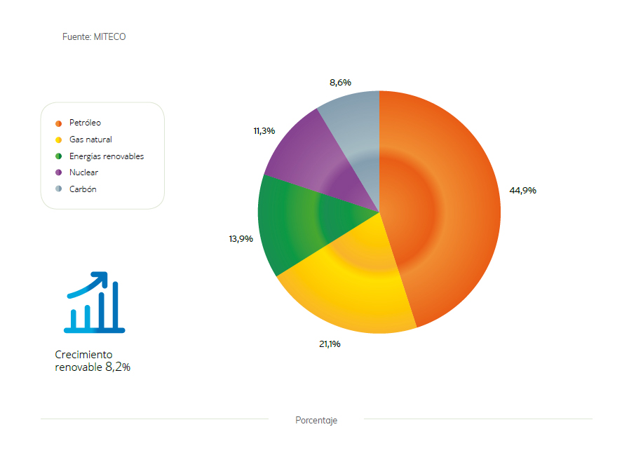 Según el IDAE (Instituto de Diversificación y Ahorro Energético) el consumo energético en España, al igual que sucede en el resto del mundo, se sustenta mayoritariamente en las fuentes de energía de origen fósil, fundamentalmente petróleo y gas natural. Cabe destacar nuestra dependencia prácticamente total del petróleo, del cual importamos más del 99%, destinando cerca del 80% del mismo al sector del transporte.