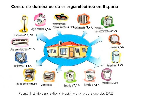Los hogares españoles son responsables del 18,5% de la energía que se consume en España. Este porcentaje se incrementaría un 17% más si tuviéramos en cuenta el uso del coche en las familias españolas. Un hogar medio en España consume cerca de 4.000 kWh al año de electricidad. En el caso de un hogar que dispusiera de todos los servicios y equipos de suministro eléctricos, el reparto medio sería el siguiente: